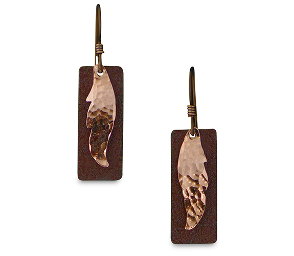 These earrings feature a textured copper feather resting on a flat recycled antique tin rectangle. These are suspended from antique copper coloured .7" hypo-allergenic niobium ear-wires.