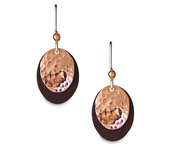 These earrings feature a textured copper oval resting on a flat recycled antique tin rectangle. These are suspended from antique copper coloured .7" sterling silver ear-wires.